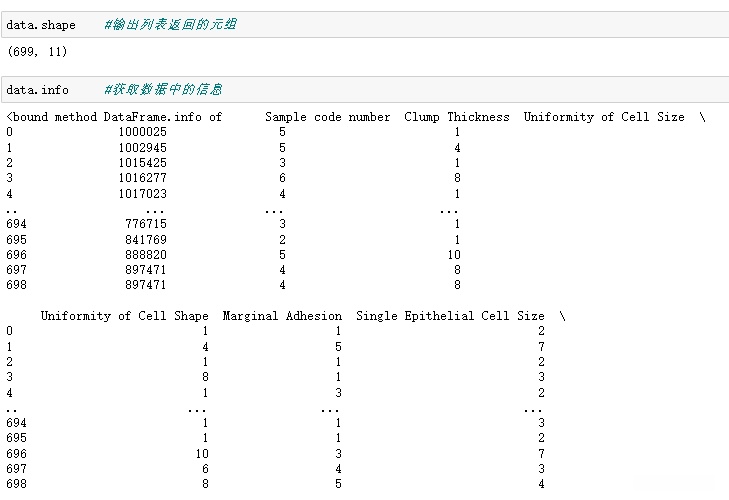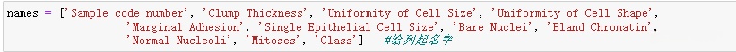 Sample code number(样本编码编号)、Clump Thickness(细胞厚度)、Uniformity of Cell Size(细胞尺寸的一致性)、Uniformity of Cell Shape(细胞形状的一致性)、Marginal Adhesion(边缘粘着性)、Single Epithelial Cell Size(单上皮细胞大小)、Bare Nuclei(裸核体)、Bland Chromatin(松软染色质)、Normal Nucleoli(正常核仁)、Mitoses(分裂次数)。