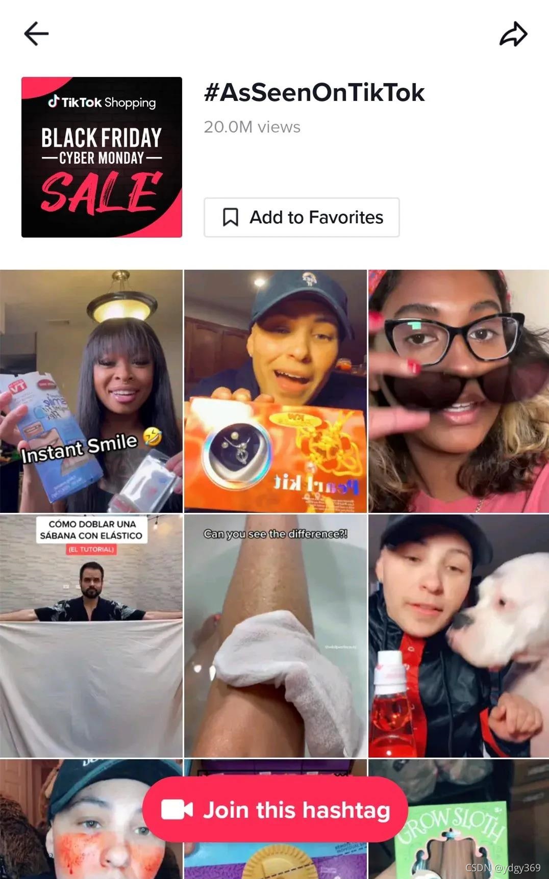 在发视频的时候,我们可以加上**#AsSeenOnTikTok、#TikTokMadeMeBuyIt** 等标签提高视频曝光量,吸引更多网友进入直播间。