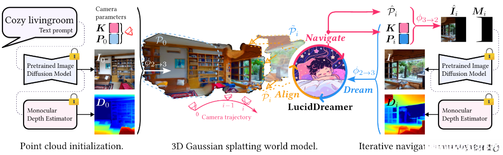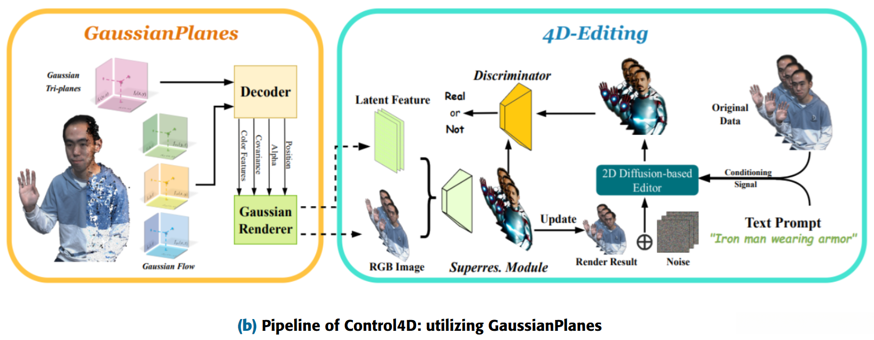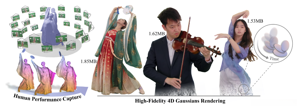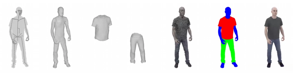 The D3GA system, starting from the left side, includes: joint angles; predicted body structure; predicted upper and lower cages; three-dimensional Gaussian distributions; clothing components; and final output image.