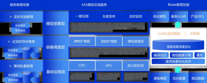 该系统提供的在线服务涵盖了PAI EAS模型以及通过Blade技术实现的推理加速功能,为客户提供了一站式解决方案,涵盖了AI部署和推理的全过程。