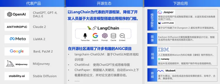 在当前市场环境中,在AIGC领域主要包含三个方面的内容:预训练AI通用模型、开放生态系统以及应用层面的实践