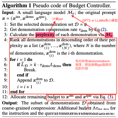 预算控制器(budget controller):根据不同组件类型(如指令、示范和问题)分配相应的压缩比例,在该系统中通过预算控制器在高压缩率范围内保持信息的整体含义。