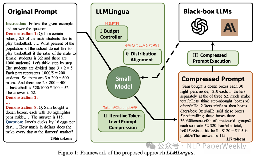 LLMLingua:所提方法的核心内容包括预算控制机制(Budget Control Mechanism)、迭代的分词级提示压缩机制(Iterative Word-level Prompt Compression Framework)以及分布对齐策略(Distribution Alignment Strategy)。