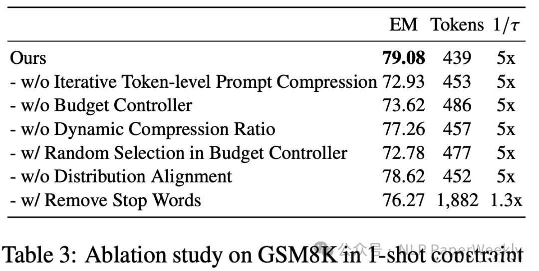 总结2: (Iterative Token-level Prompt Compression)这一组件对于保持压缩提示与原始提示的高度匹配至关重要。缺少这一组件会导致精确匹配分数明显下降。