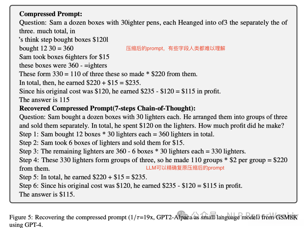 总结3:在经过高度压缩的形式下的人类可能无法对prompt进行解析分析的场景下,LLM依然具备能力去恢复并输出原始的prompt内容。