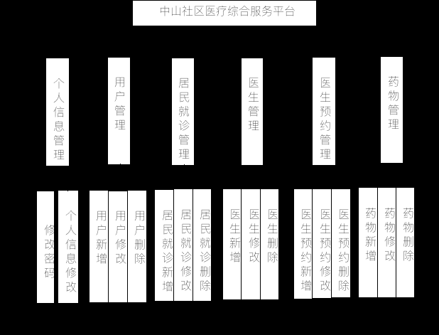 中山社区医疗综合服务平台的受益群体主要是工作人员,该网站能够方便使用者进行数据信息的查找和管理工作,本次开发的网站我们设计的界面展示主要分为管理员界面以及用户界面,具体界面的功能分布如下。