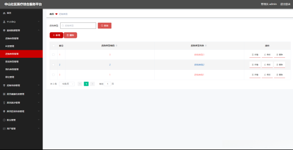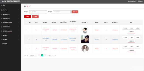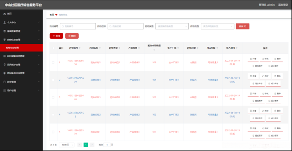 中山社区医疗综合服务平台管理员可以管理用户的基本信息,可以管理药物信息,可以管理药物信息等。