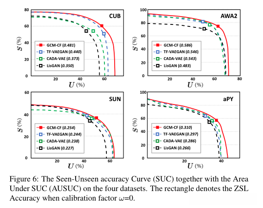3)AUSUC,通过绘制一系列ZSL精度的反差来绘制可见-不可见精度曲线(SUC),其中该系列是通过调整校准因子ω来获得的,该校正因子ω从可见类的分类器分对数中减去。然后我们使用SUC(AUSUC)下的面积进行评估。