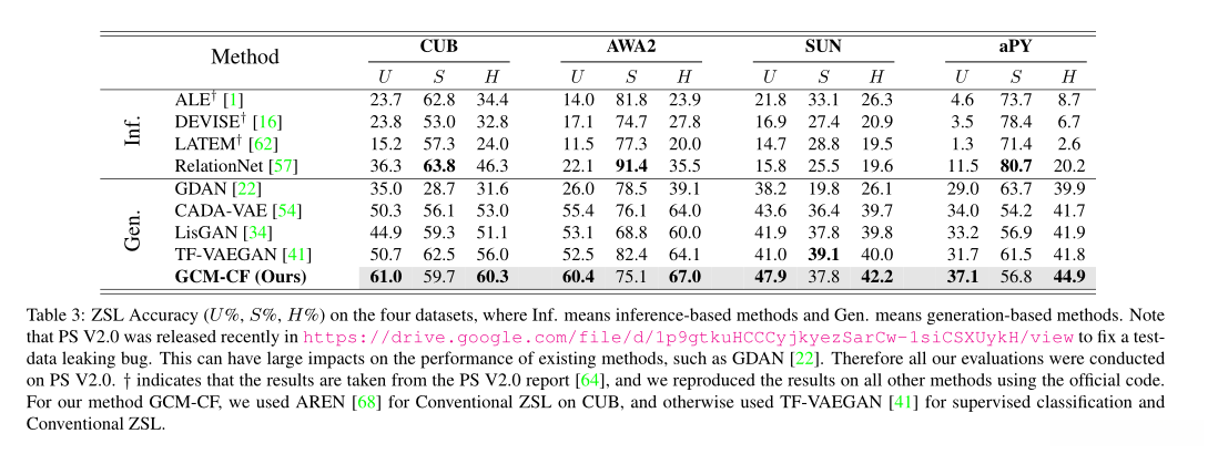 ZSL在标准基准数据集上评估方法: Caltech-UCSD-Birds 200-2011 (CUB) 、Animals with Attributes 2 (AWA2) 和 attribute Pascal and Yahoo (aPY),并且根据Proposed Split (PS) V2.0对可见类和不可见类进行分割。