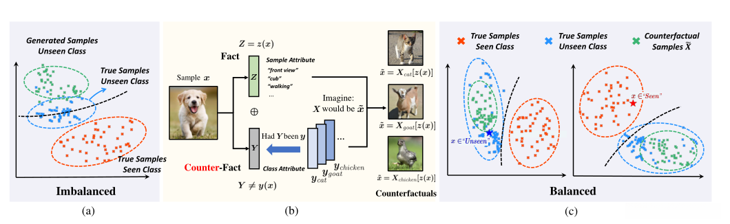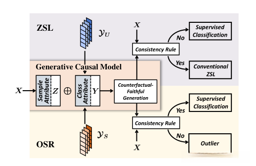 文献提出一个反事实框架,是由对不可见类的泛化来支撑的。作者基于反事实的一致性规则(反事实确实是基本事实,反事实就等于事实)改变可见和不可见类的类属性来作为二元分类器。拟议的反事实框架是第一个为平衡和改进可见/不可见分类提供理论依据的框架。特别是,作者表明,分离Z和Y的质量是关键瓶颈,因此它是ZSL/OSR未来的一个潜在方向。