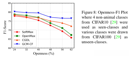 2)Openness-F1图,研究不同Openness下的F1的反应:1-\sqrt{2N/(N+M)},其中N和M分别是可见类和不可见类的数量。与开放性固定的单个F1分数相比,该图显示了OSR分类器对未知数量的未看见类的开放环境的鲁棒性。