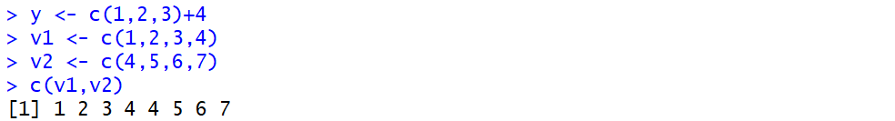 y <- c(1,2,3) + 4 # 单个的数值4会被补齐为c(4,4,4),最后结果为c(5,6,7)