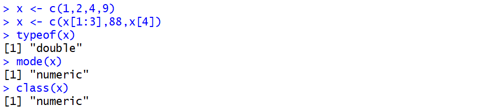 typeof(x) #查看向量里的元素的类型(细类),注意默认是double。[1] "double"