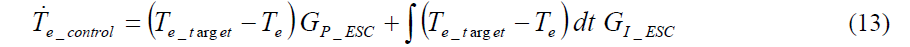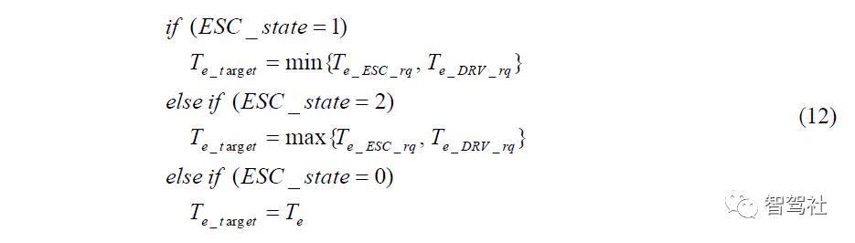 该VS模型采用了一个内嵌的P + I控制器系统,在公式7中进行发动机扭矩Te_control的调节作用。该系统通过引入新的IMP_ESC ENGINE CON STATE变量来区分三种不同的工作状态:其一是无控制状态;其二是减控制状态;其三是增控制状态。具体而言,在引入该变量后:当ESC运行于减速模式时(IMP_ESC ENGINE CON STATE = 1),ESC的目标输出将依据当前场景与驾驶员需求进行综合考量;例如:当ESC运行于加速模式时(IMP_ESC ENGINE CON STATE = 2),ESC将优先满足自身运动需求而略降发动机转速;而在无控制状态下(默认值为0),相关参数均被设为默认值以维持稳定运行。
