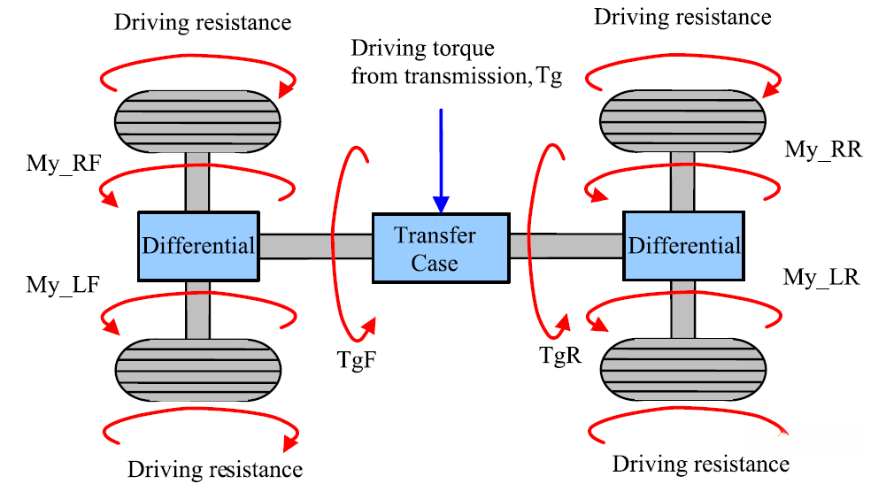 该动力系统模型由发动机、动力传递机构(包含变矩器或机械离合器)、变速器、中央分力分配装置(适用于四驱系统)以及车桥上的差速装置组成。如图所示。