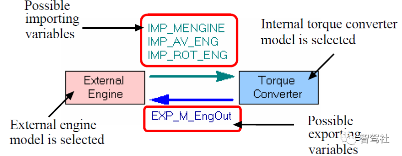 在界面上呈现的框图中使用了红色箭头来描绘发动机至车轮的动力传递关系。若采用外部模型,则内部模型的信息将被完全忽略;这表明所有功率都将通过外部模型进行传递。因此内部模型将不向后续组件传输任何扭矩或物理参数(如旋转角度与转速)。参考图5可得相关详细信息。