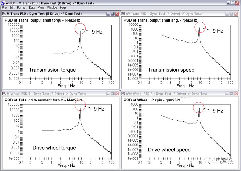 图7展示了采用VehicleSim车辆模型进行仿真所得频谱分析结果中的功率谱密度实例。在这一实例中,默认固有频率设定为9Hz且阻尼比设为零值。仿真实验表明,在此情景下汽车被抬离地面并使主离合器脱离工作状态。随后,在变速器输入轴端施加了随机输入扭矩信号,并监测了变速器输出轴以及车轮两端的角度变化情况以及传递扭矩值。值得注意的是该系统采用后轮驱动方案运行如图所示当观察图中的数据可以看出在变速器与车轮之间传递的过程中传递出的角度变化特征及其所伴随的扭矩数值均呈现出与系统所接受输入参数(9Hz)相一致的行为模式