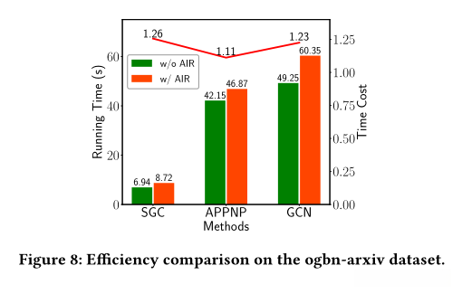 在本小节中,我们评估了AIR在ogbn-arxiv数据集上的效率。这里我们只报告训练时间,因为在真实世界的场景中,训练阶段总是消耗最多的资源。SGC、APPNP和GCN在有或没有AIR的情况下训练时间结果展示在图8。所有比较的方法中,
