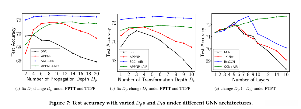 ,因为在这个架构中,P和T操作是纠缠在一起的。实验结果显示在图7(c)。与基线方法GCN、JK-Net和ResGCN相比,随着层数的增加,GCN+AIR的预测准确率呈稳定上升趋势,这再次验证了AIR的有效性。