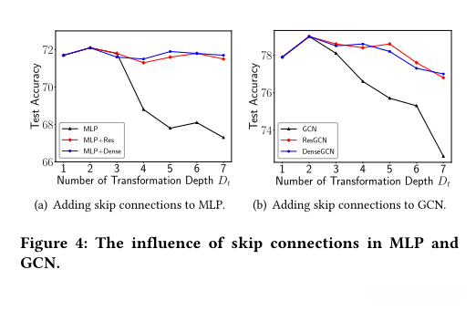 目前主流的GNN框架一般都是二层和三层的结构,一方面二层和三层的结构最终的模型性能表现还不错,另一方面若层数增加,就会带来模型性能下降问题以及计算量过大问题。但是直观的感觉来说,如果一个节点能用上更多的邻居对它最后的预测是有帮助的。作者把GNN深度分为传播深度和变换深度,传播深度指的是节点训练时要取到多少阶邻居,这是之前认为过平滑问题的原因就在于节点聚合了过多的邻居信息造成的;变换深度指的是激活操作(激活函数)和降维操作(左乘参数矩阵)的次数。通常的GNN传播深度和变换深度是耦合的,即二层GCN需要二阶邻居,三层GCN需要三层邻居,作者把这两个深度解耦开来,思想和ShaDowGNN有点像。