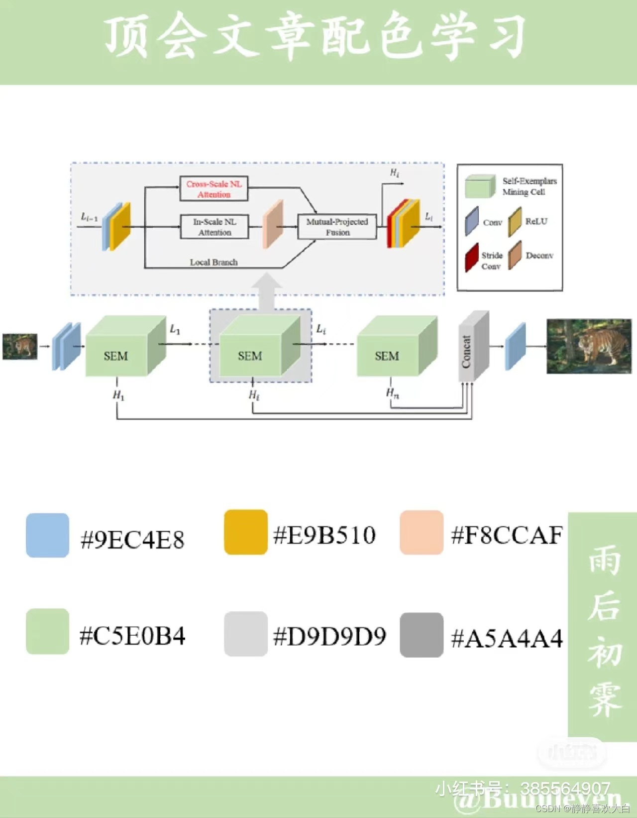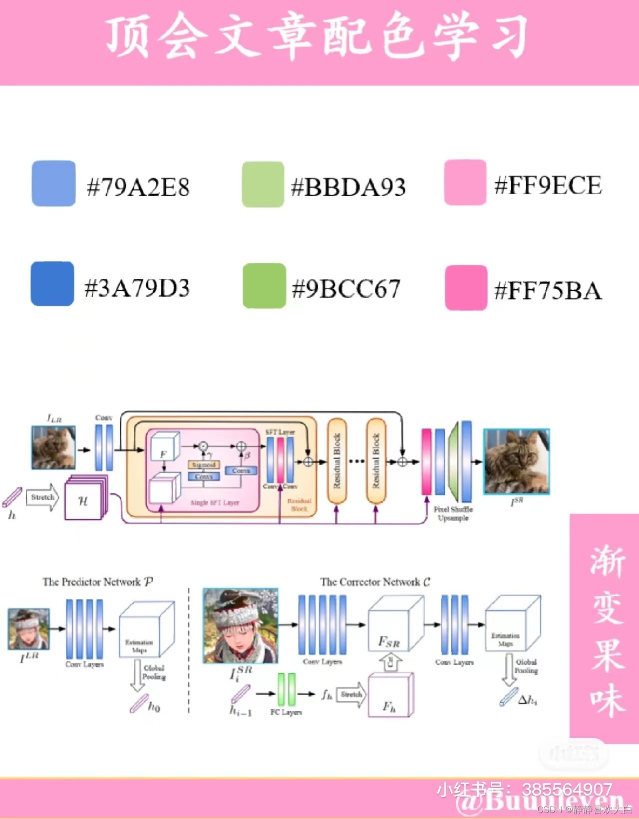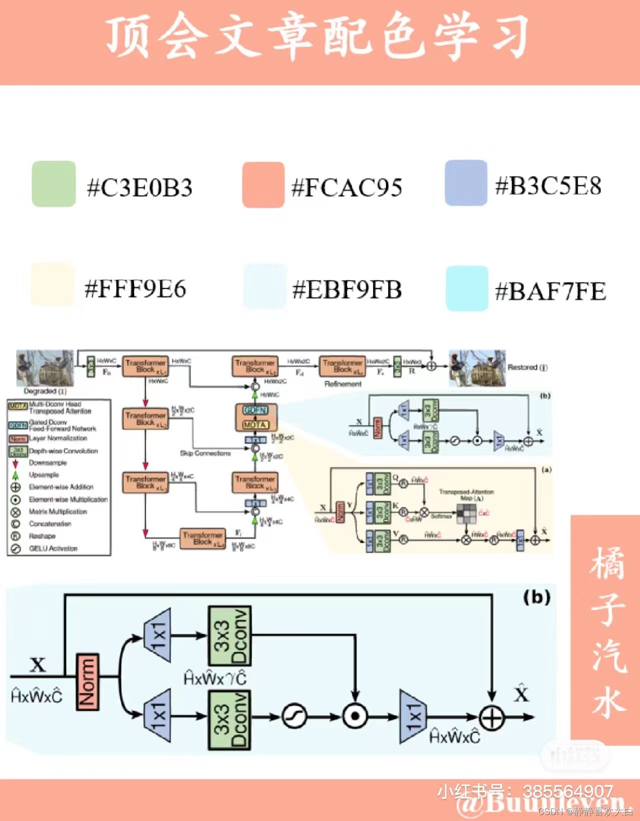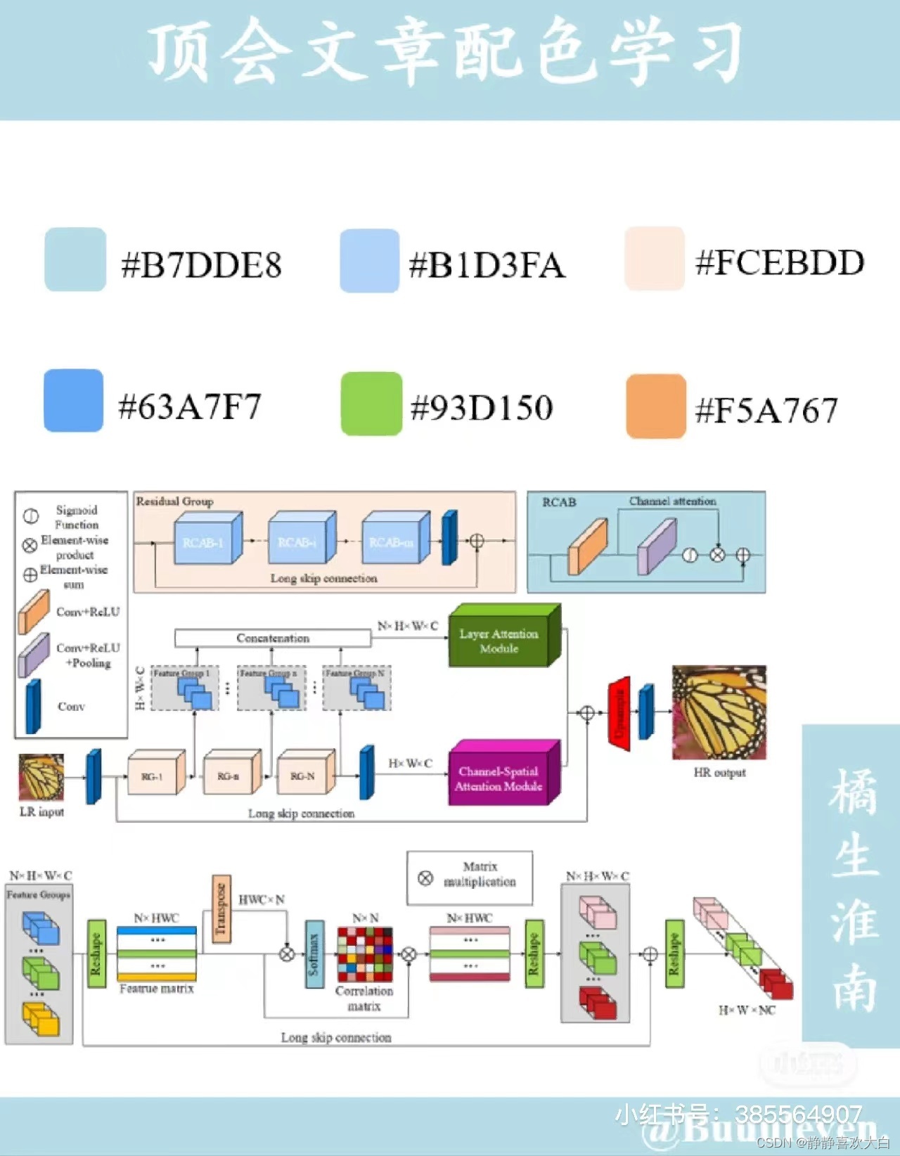 - 无论是哪种图,参考最近的CV顶会论文,配色一般是淡蓝、淡红、淡黄、淡绿 四种(彩虹一共才7种颜色,要体现对比就只能是这四种颜色了,汗 ... ... ),有时会用 紫色、灰色补充(紫色多用于模块,灰色多用于小区域或者大面积打底)。
