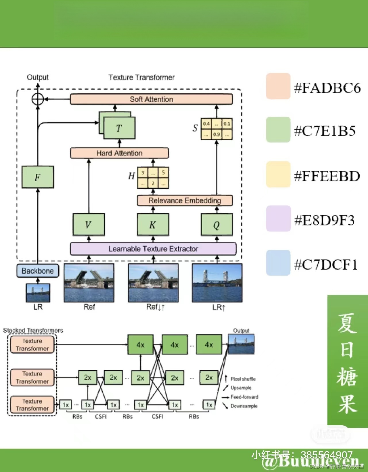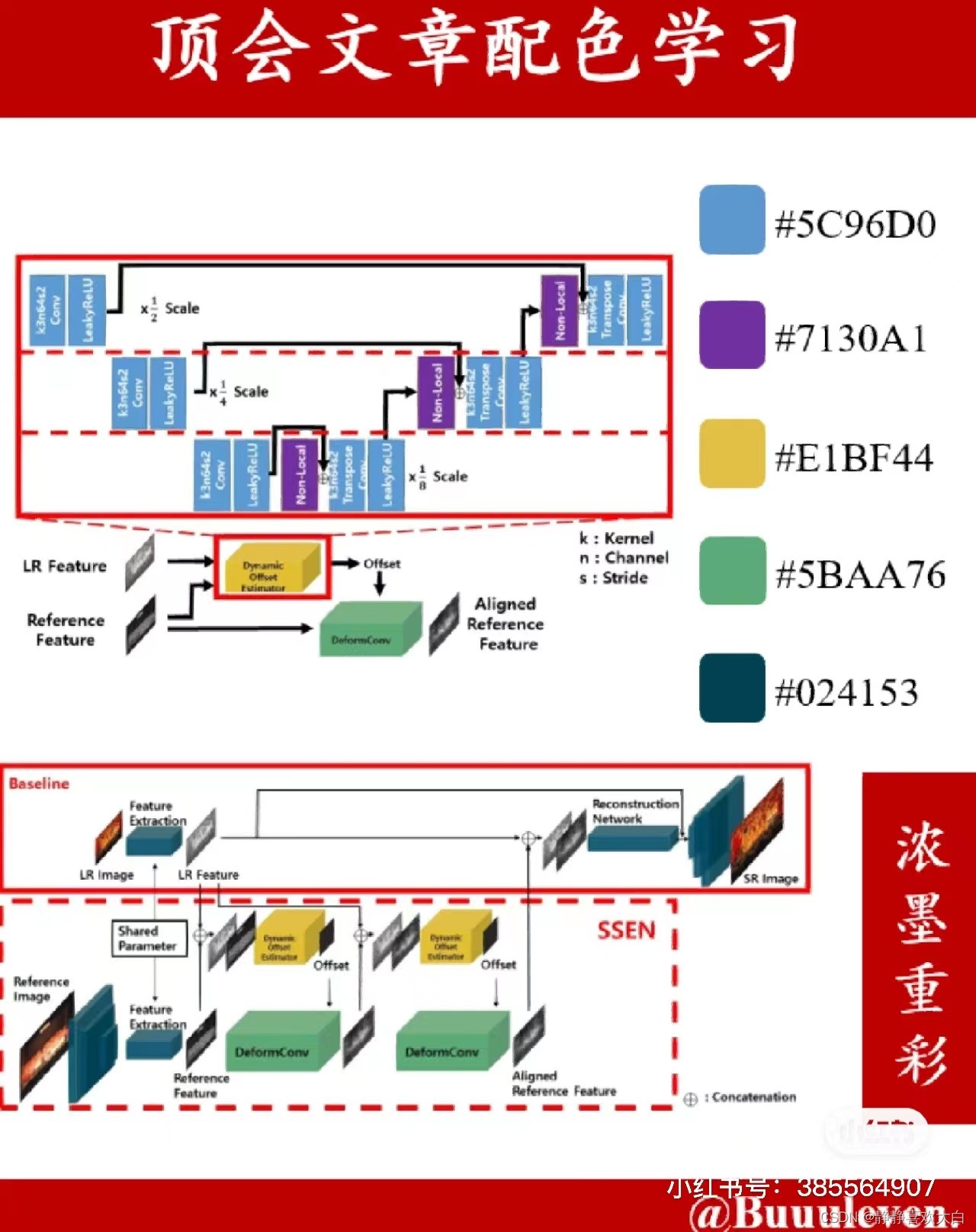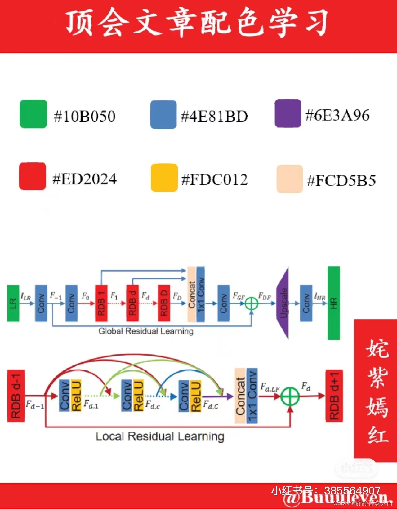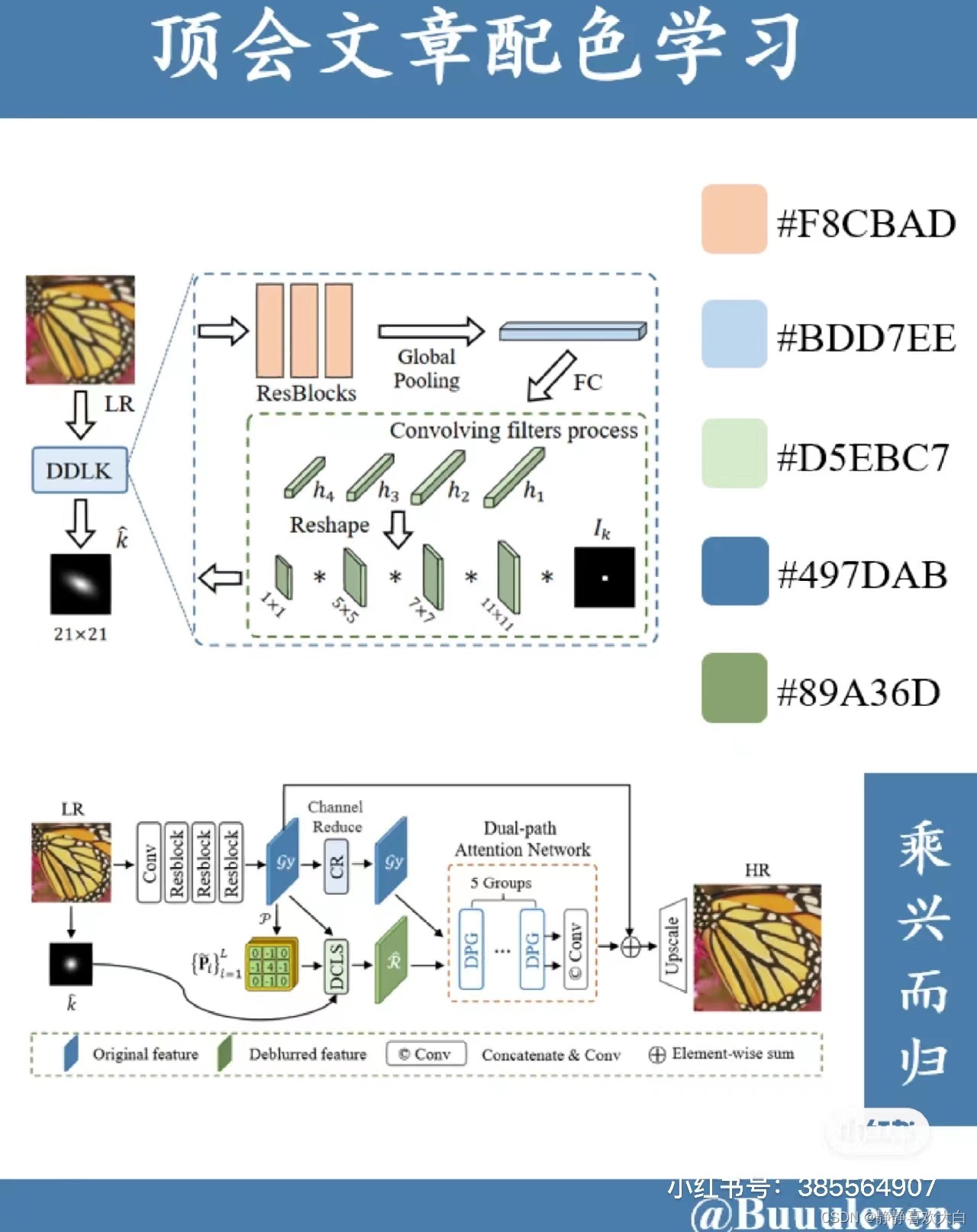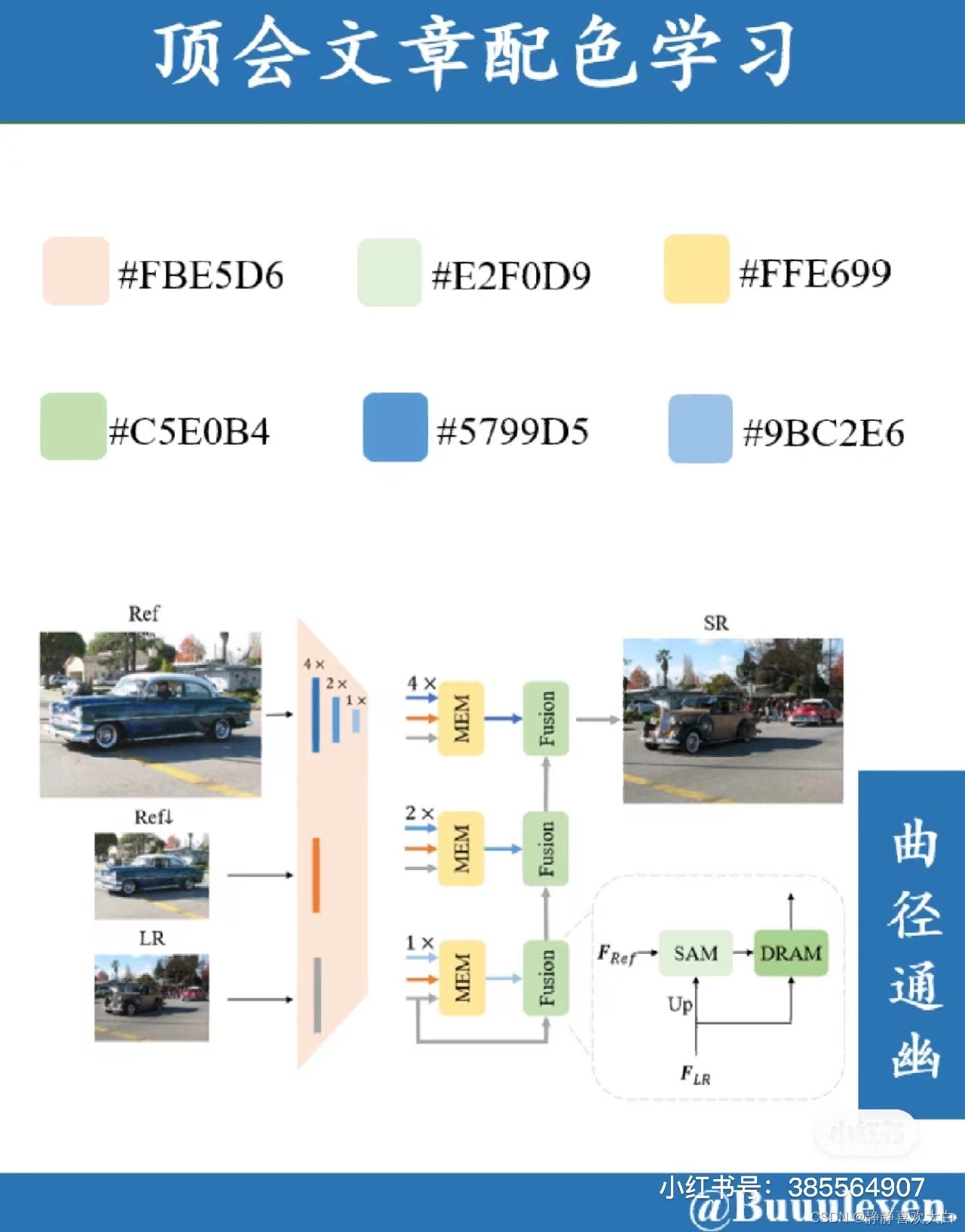 - 无论是哪种图,参考最近的CV顶会论文,配色一般是淡蓝、淡红、淡黄、淡绿 四种(彩虹一共才7种颜色,要体现对比就只能是这四种颜色了,汗 ... ... ),有时会用 紫色、灰色补充(紫色多用于模块,灰色多用于小区域或者大面积打底)。