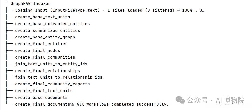 构建索引的基本过程如下:首先,它会将输入文本进行拆分,然后提取实体与关系,生成摘要信息,并根据这些信息构建内存中的图结构。接下来,它会从这个图中识别出各个社区,为每个社区创建报告,并在图中创建文本块节点和文档节点。