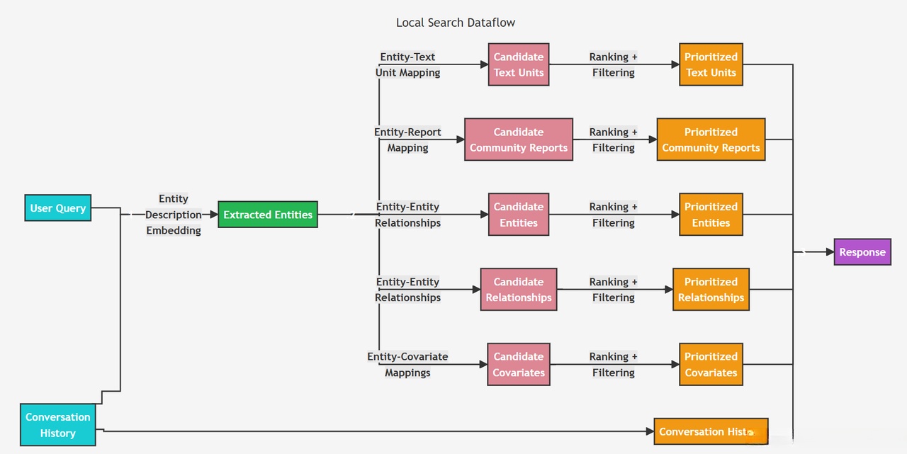 在接收到用户查询以及(可选的)对话历史后,本地搜索方法会从知识图谱中识别出与用户输入语义相关的一组实体 。