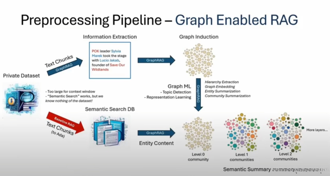 文本块经过GraphRAG的处理,进行信息抽取,然后通过图归纳(Graph Induction)生成图结构。这个图结构用于表示层次、主题检测、实体总结等高级语义信息。