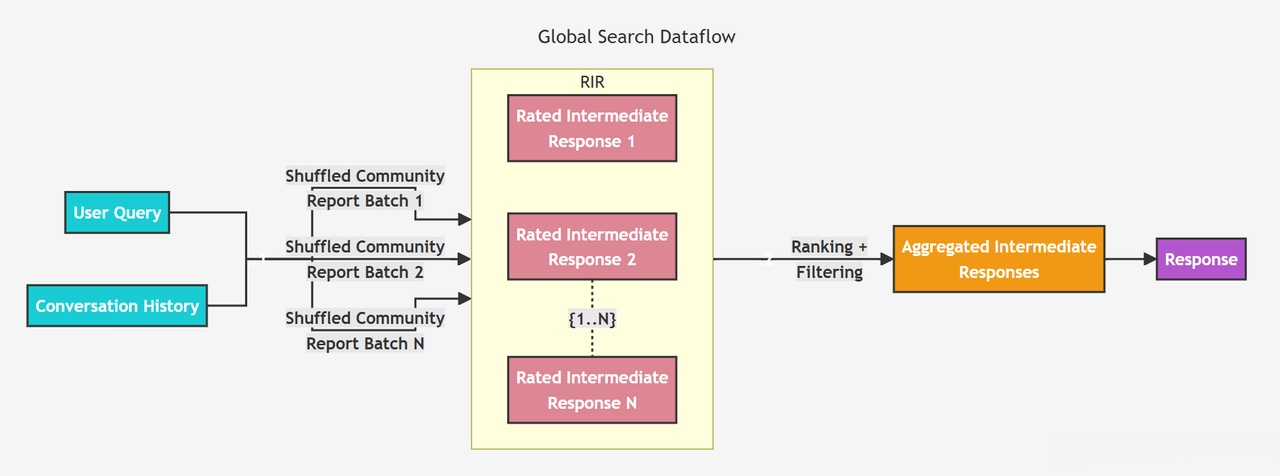 在接收到用户查询以及(可选的)对话历史后,全局搜索方法使用来自图社区层级结构中指定层级的一系列由LLM生成的社区报告作为上下文数据,以map-reduce 的方式生成响应。