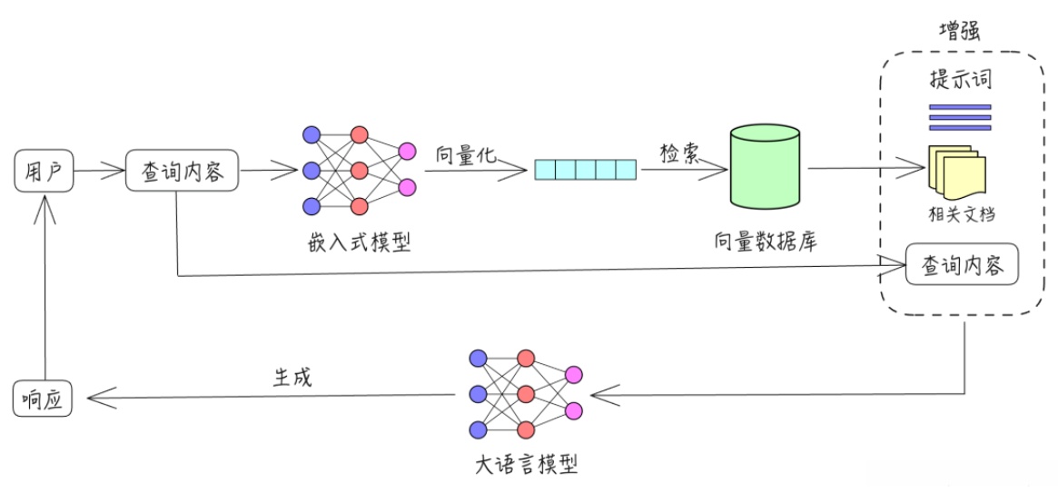 - 增强 : 将用户的查询内容和检索到的相关知识一起嵌入到一个预设的提示词模板中。