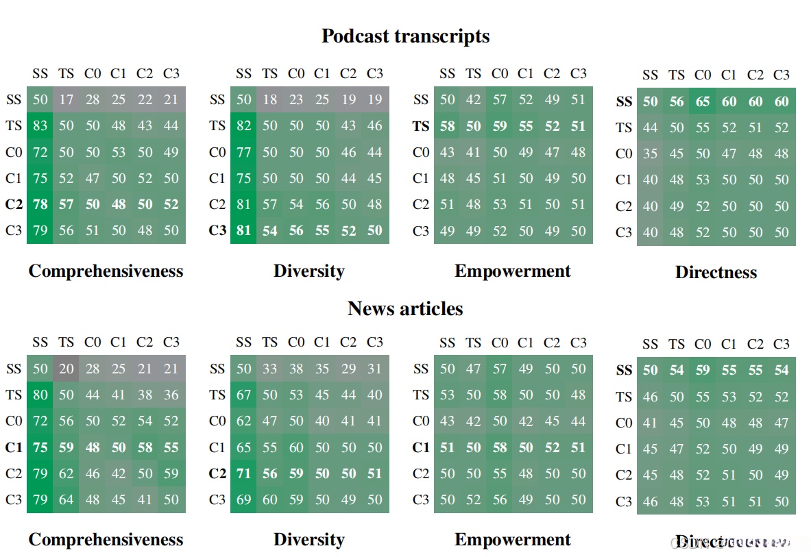 中间层次的摘要在全面性上的胜率为 57%,多样性上的胜率也是 57%。