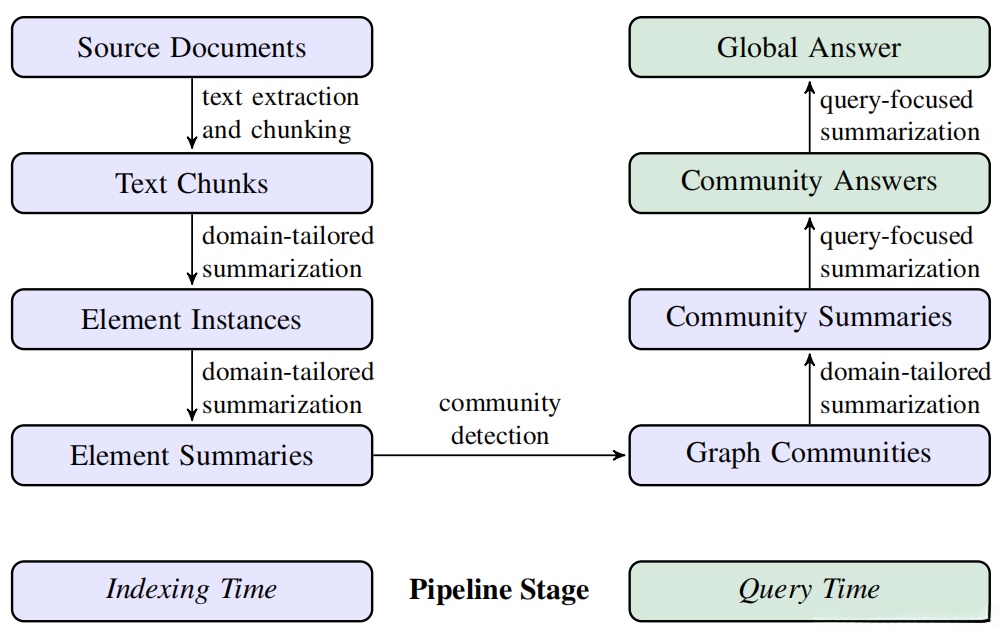 与普通RAG系统类似,GraphRAG整个Pipeline可划分为索引 与查询 两个阶段。索引过程利用LLM提取出节点(如实体)、边(如关系)和协变量(如 claim),然后利用簇检测技术对整个知识图谱进行划分,再利用LLM进一步总结。