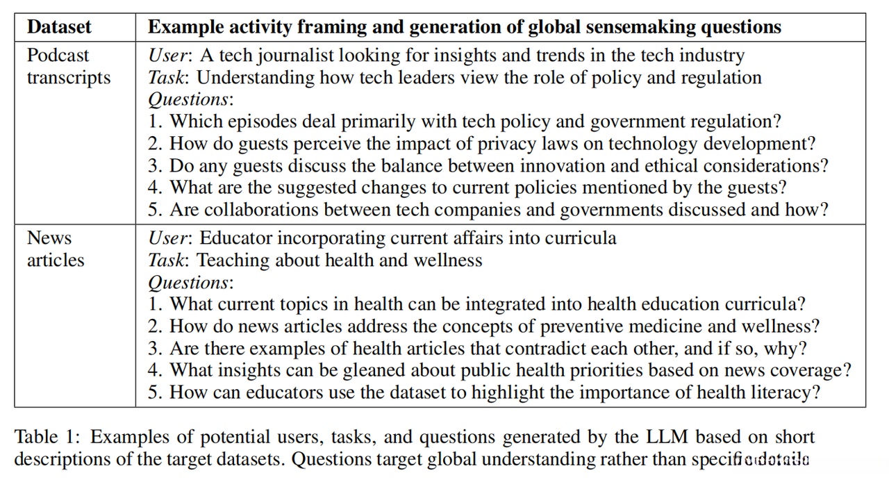 索引过程产生了播客数据集的一个由8564个节点和20691条边组成的图,以及新闻数据集的一个由15754个节点和19520条边组成的更大的图。该表显示了在每个图的社区层次结构的不同层次上的社区摘要的数量。