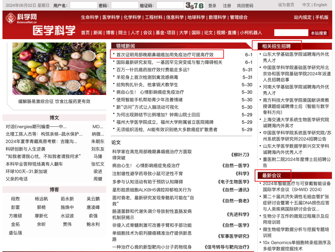 选择医学科学栏目后意外发现进入页面后可以看到与自己研究领域相关的鼻咽癌相关报道右侧还有招生招聘以及最新的学术会议信息