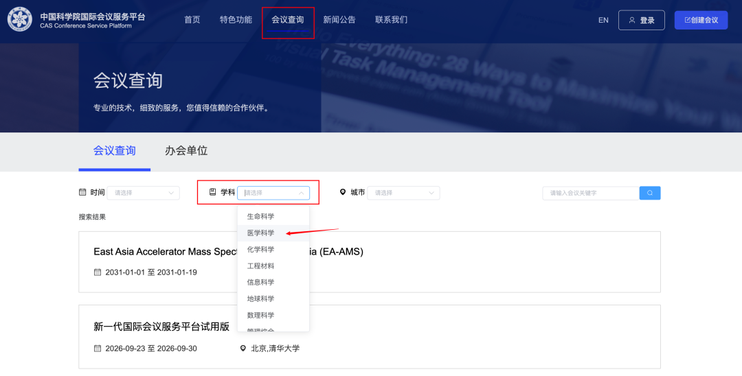 无需注册即可依据学科进行查询相关信息。接下来以医学科学为例演示。