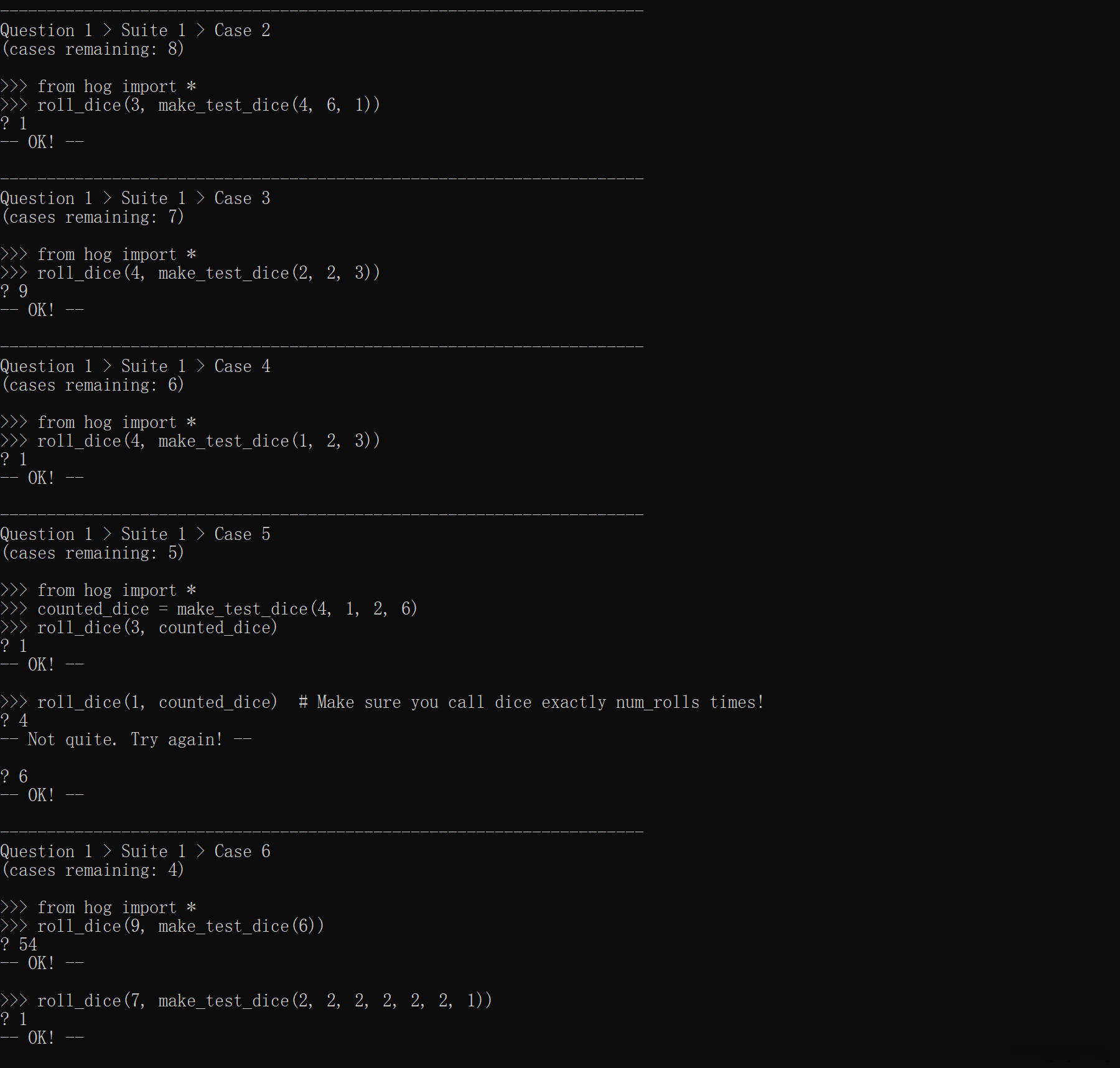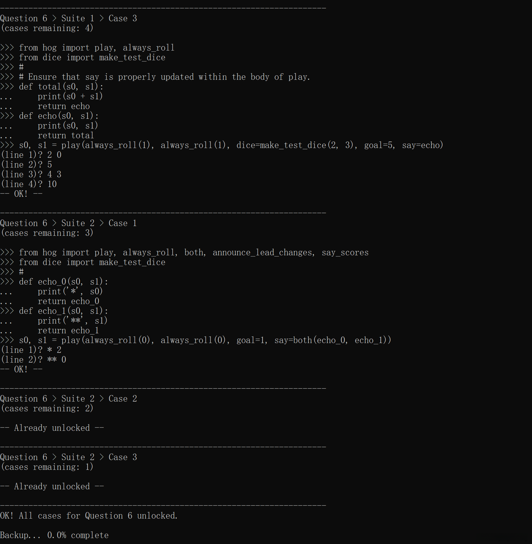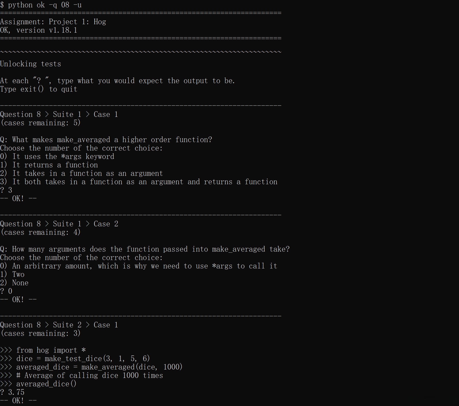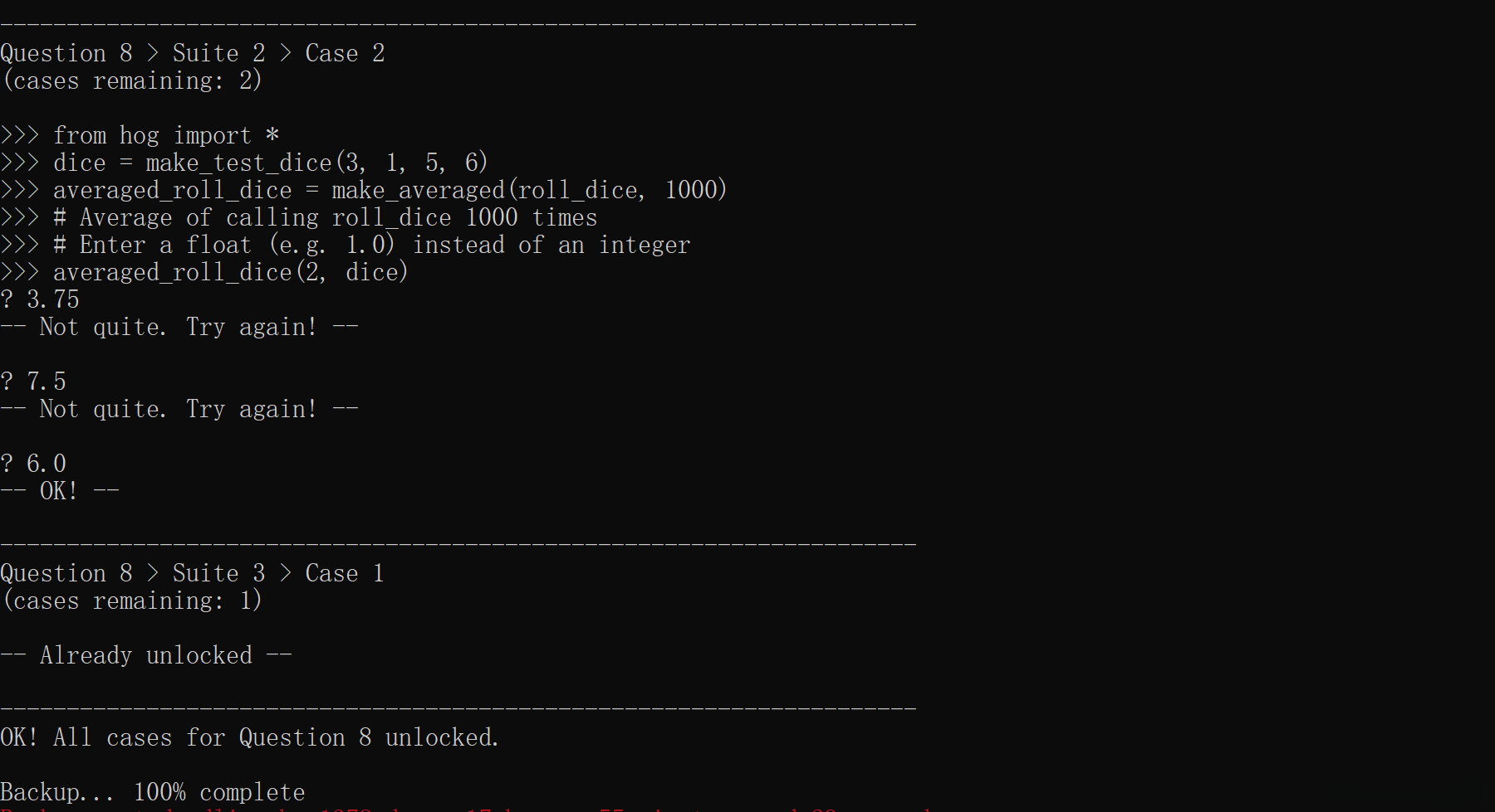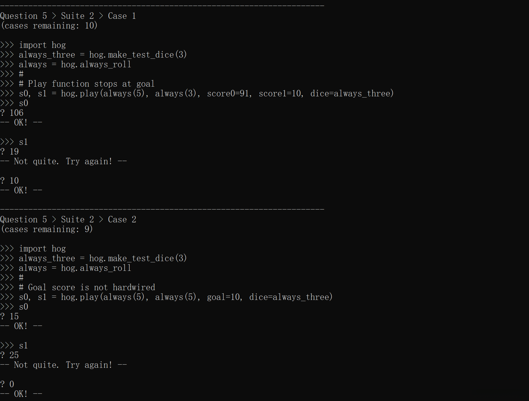 项目简介:为骰子游戏Hog开发一个模拟器和多种策略,需要同时使用控制语句和高阶函数(Lecture14) Phase1:Simulator 按照HintVideo里给的Pseudocode转成代码(注...