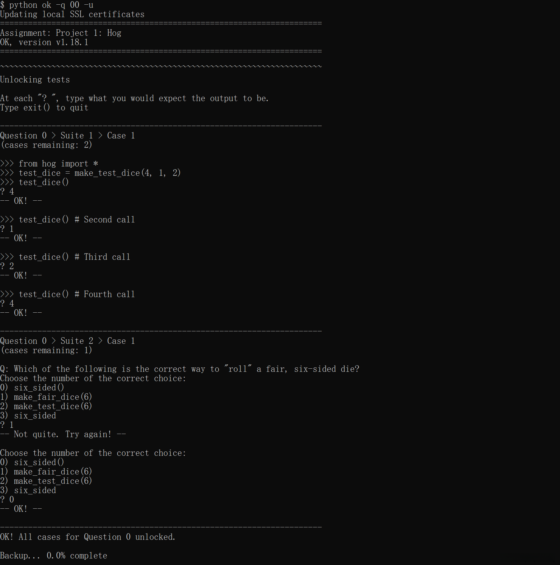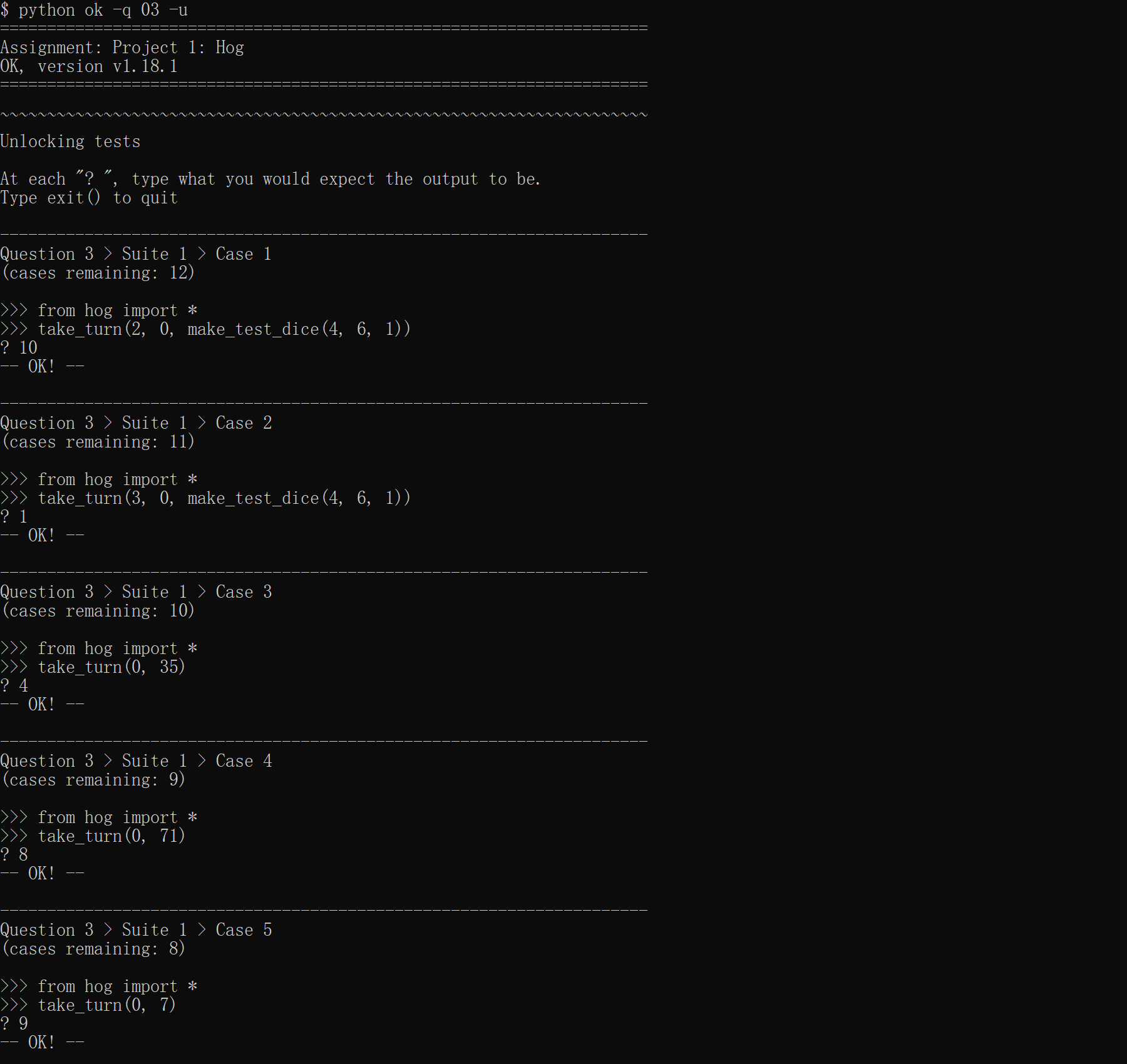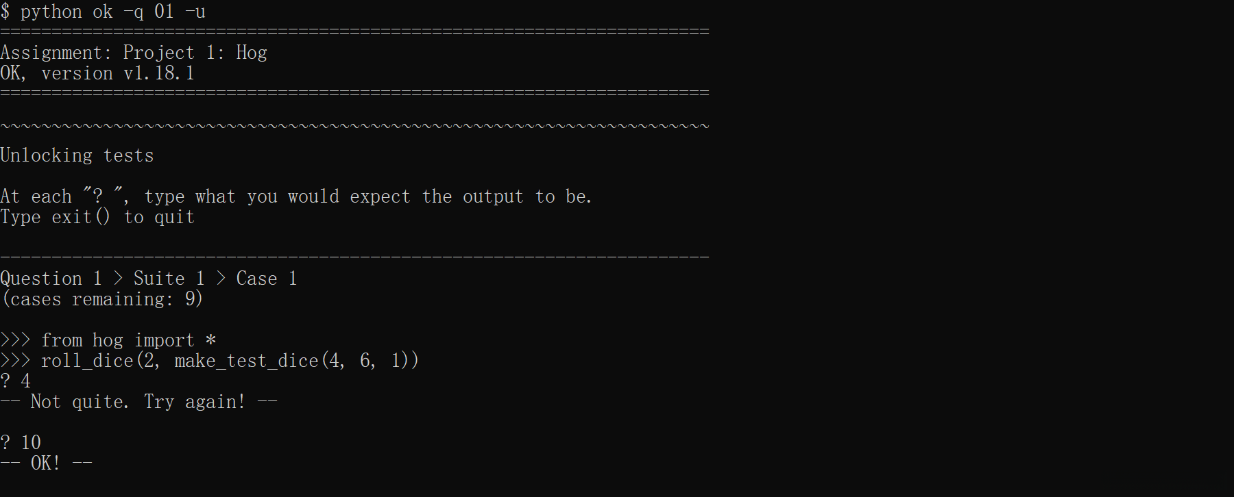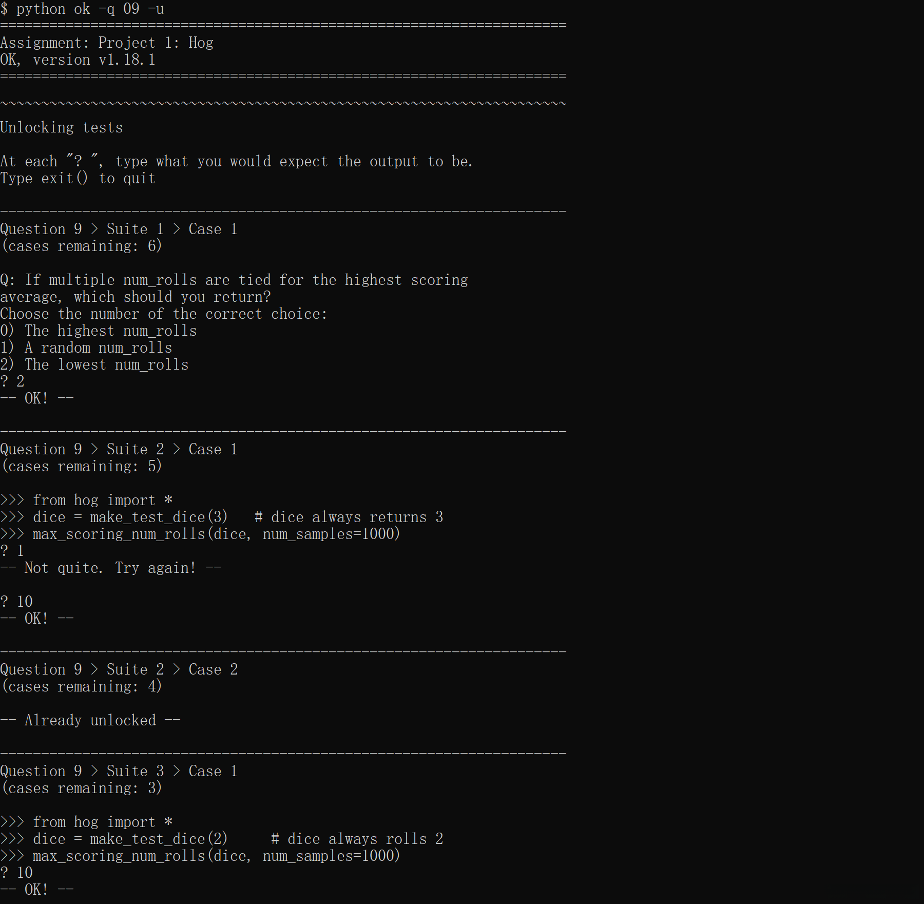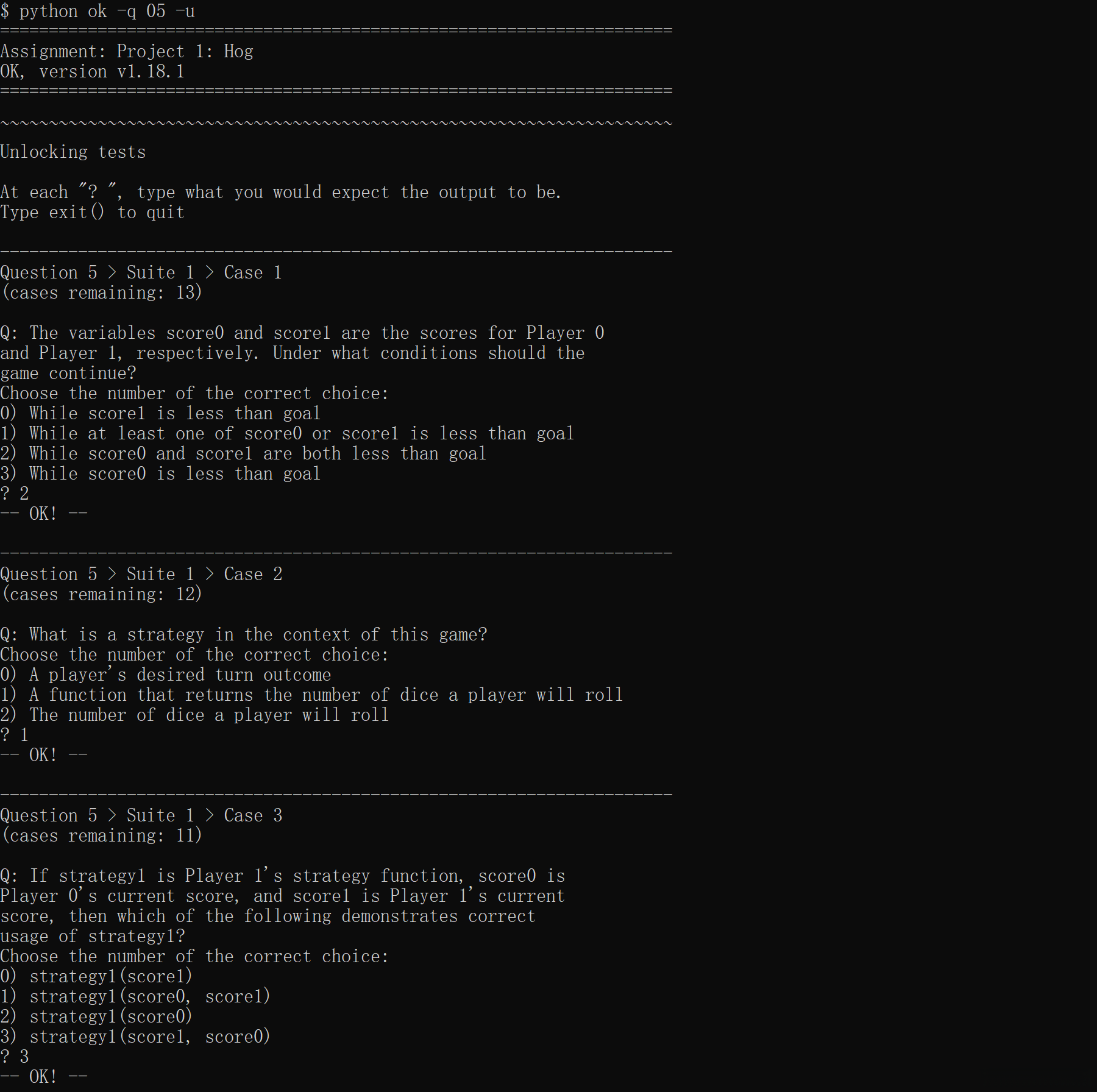 项目简介:为骰子游戏Hog开发一个模拟器和多种策略,需要同时使用控制语句和高阶函数(Lecture14) Phase1:Simulator 按照HintVideo里给的Pseudocode转成代码(注...
