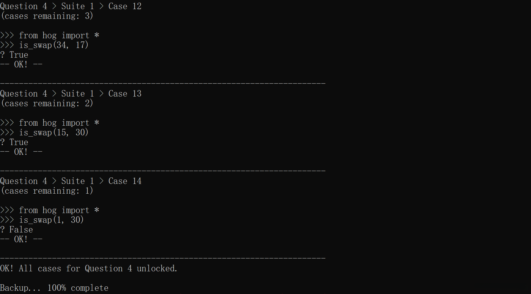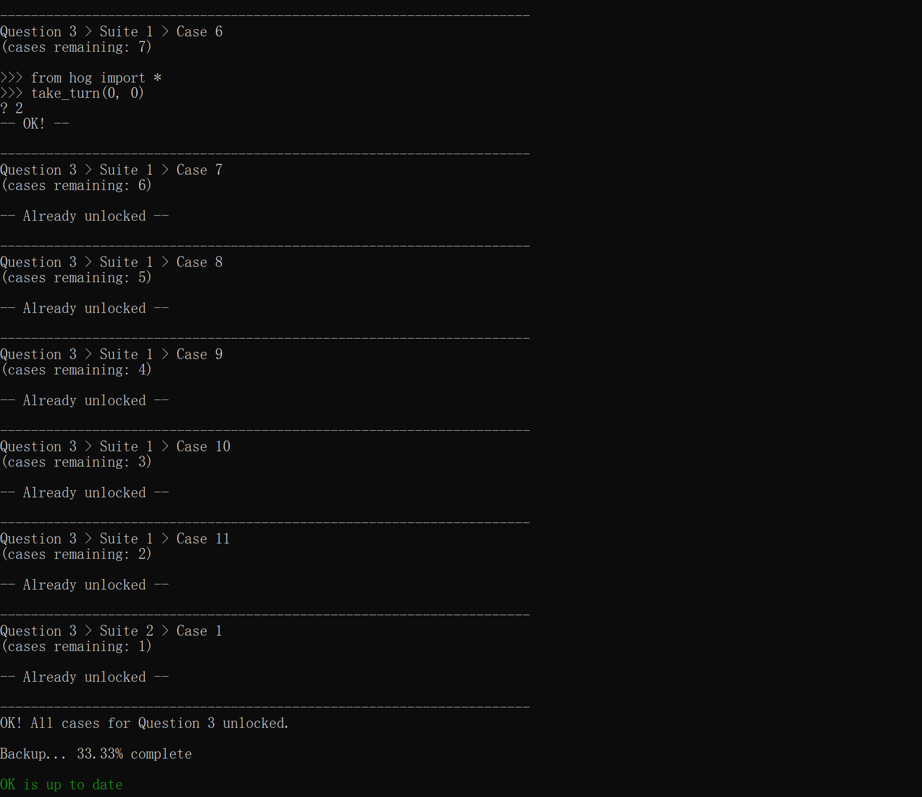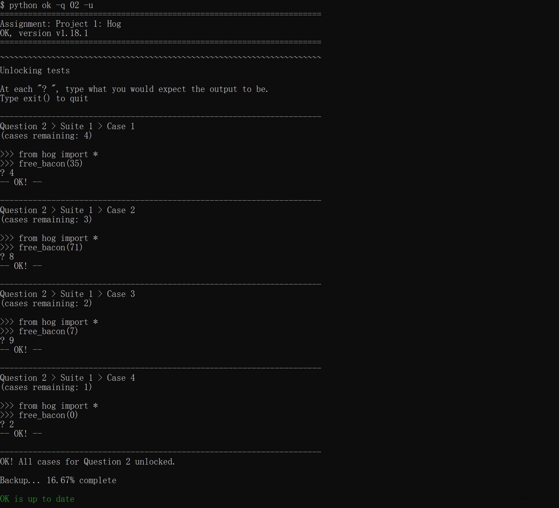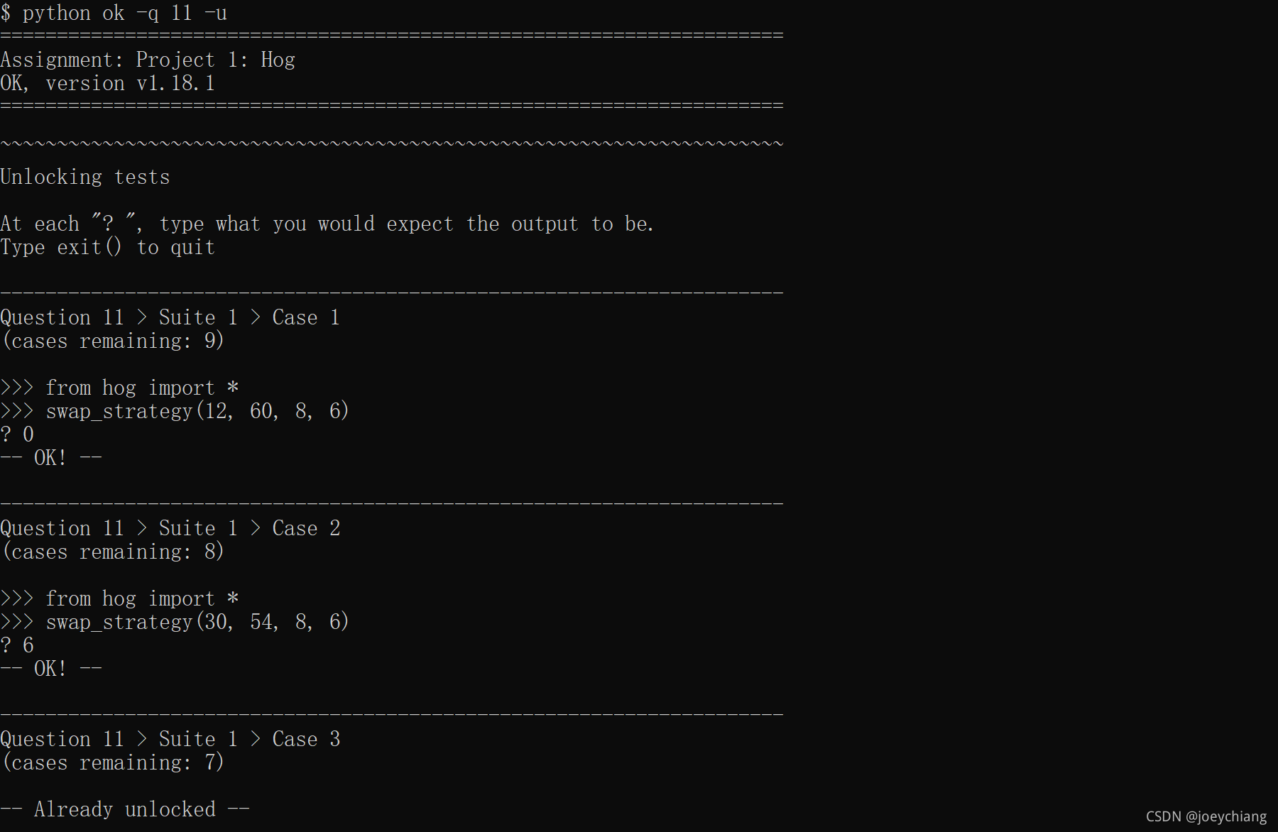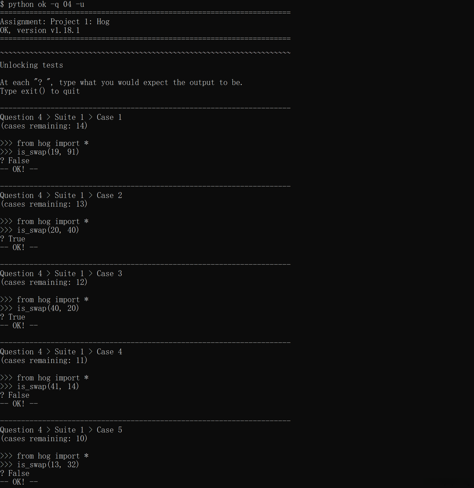 项目简介:为骰子游戏Hog开发一个模拟器和多种策略,需要同时使用控制语句和高阶函数(Lecture14) Phase1:Simulator 按照HintVideo里给的Pseudocode转成代码(注...