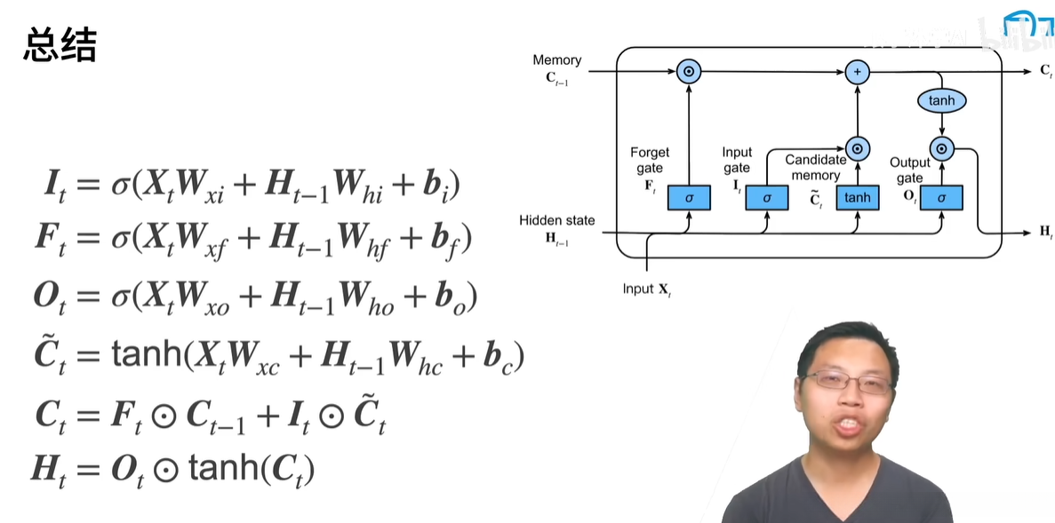 - LSTM 和 RNN/GRU 的不同之处在于: LSTM 中的状态有两个, C 和 H