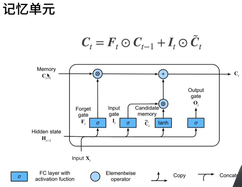 - 如果遗忘门始终为 1 且输入门始终为 0 ,则过去的记忆元 C(t-1) 将随时间被保存并传递到当前时间步(引入这种设计是为了缓解梯度消失的问题,并更好地捕获序列中的长距离依赖关系)