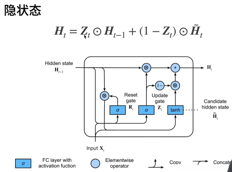 - 更新门(update gate):能关注的机制 ,能够将信息尽量放在隐藏状态中,控制新状态中有多少个是旧状态的副本