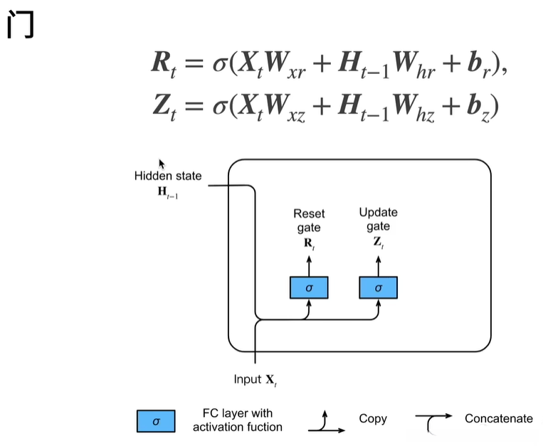 - 上图表示门控循环单元模型,输入是由当前时间步的输入和前一时间步的隐状态给出;重置门和更新门的输出是由使用 sigmoid 激活函数的两个全连接层给出