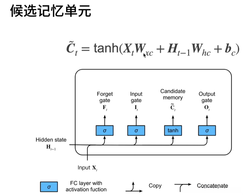 候选记忆元的计算与输入门、遗忘门、输出门的计算类似,但是使用了 tanh 函数作为激活函数,函数的值在 -1~1 之间