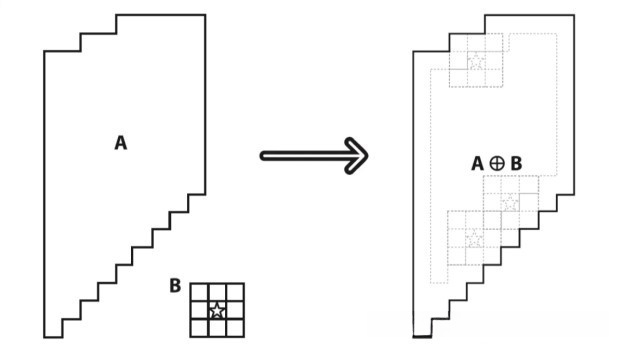 经过二值化处理的图像后因为外在因素,单纯二值化效果仍然不理想。存在噪点和物体上的斑点。这时候可以运用到数学形态学去处理图像,其基本运算有:膨胀、腐蚀、开和闭运算。消除物体的边界点,使边界向内收缩,可以把小于结构元素的物体去除。对二值化物体边界点进行扩充,将与物体接触的所有背景点合并到该物体中,使边界向外部扩张。闭运算为先膨胀再腐蚀能够去除物体上的斑点,闭运算为先腐蚀再膨胀能去除物体外噪点。