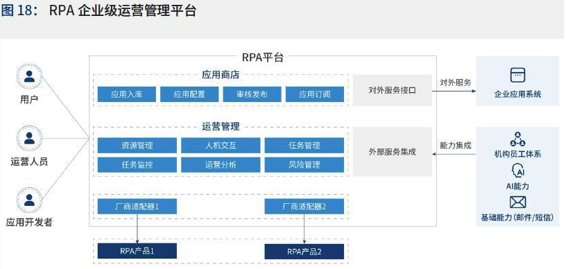 传统 RPA 产品由开发平台、控制中心、终端机器人组成。RPA 已推出银行、财税、政务、保险、证券基金等数十种不同岗位的机器人员工。在售后工单处理、商业案例报告生成、供应商准入核实、智慧政务行政审批、金融文档的抽取验查和填写等场景中已开展工作