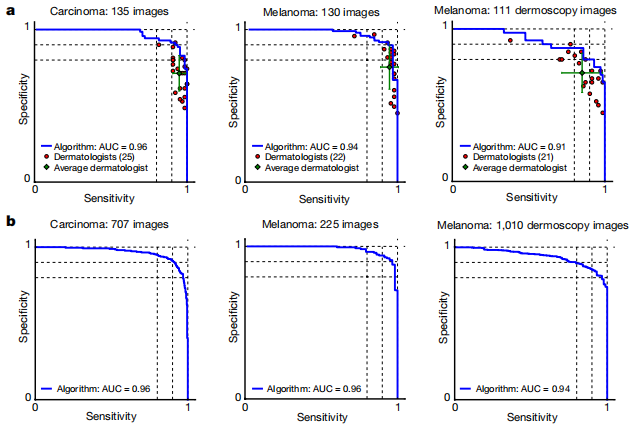 这些红色标记点代表了皮肤科医生的专业水平,在分类器性能曲线下方几乎找不到符合标准的表现,在经过不同规模的数据集以及各类别数据进行评估时均能达到91%以上的准确度。然而这实在令人感到不满的是