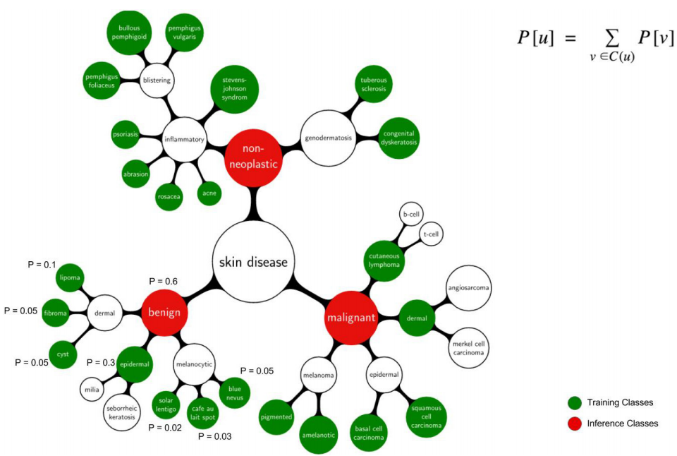 论文中对于这一问题提供了一个更为直观的可视化说明。其中绿色节点代表了757个具体的输出类别而红色节点则属于更为粗粒度覆盖范围更广的分类体系。值得注意的是大类的概率则是所有子类概率之和