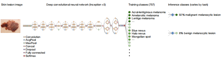 这篇关于皮肤癌分类的文章重点在于分类器,在《自然》杂志上由斯坦福大学的研究团队发布。竟然发表在《自然》杂志上让我感到惊讶又钦佩。虽然在方法上有一定的创新性,但论文本身的价值却非常显著,特别是这篇文章自发表以来已经获得了超过1300次引用,令人钦佩且值得学习。