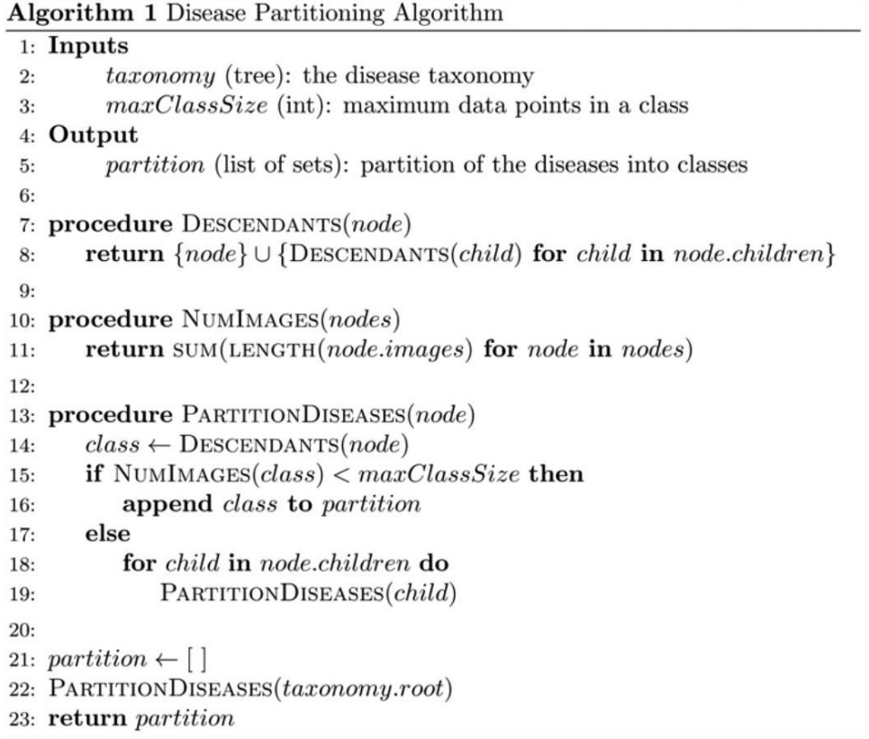 在这些图像中总共涵盖了2032种疾病,在训练分类器的过程中,默认输出类别被归纳优化至757类这一操作即本文第二项主要贡献所在的具体实现方法即本文第二项主要贡献在于通过一种系统化的方法实现了对复杂度较高的分类任务的有效管理论文研究还特别提供了这一过程的具体说明其中展示了一个层次分明的树状结构其中每个具体的疾病都被明确标注为叶子节点随后通过层层聚合形成了更为广泛的分类范畴